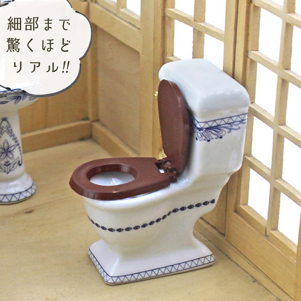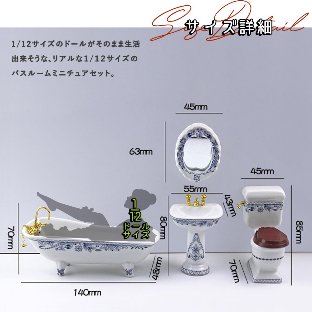 Moin moin Миниатюрный керамический набор для ванной комнаты в масштабе 1/12 (4 шт): Туалет, Ванна, Зеркало и Раковина, Синий Цветочный Узор, Кукольные Фигурки, 2503mini72