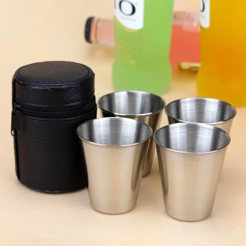 4 шт./набор из полированной нержавеющей стали 30 мл мини-рюмки для питья вина с кожаным чехлом для домашнего кухонного бара