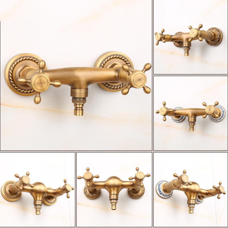 Античная латунь Настенные смесители для стиральной машины Двойные ручки 2 отверстия Смеситель для холодной и горячей воды Кран