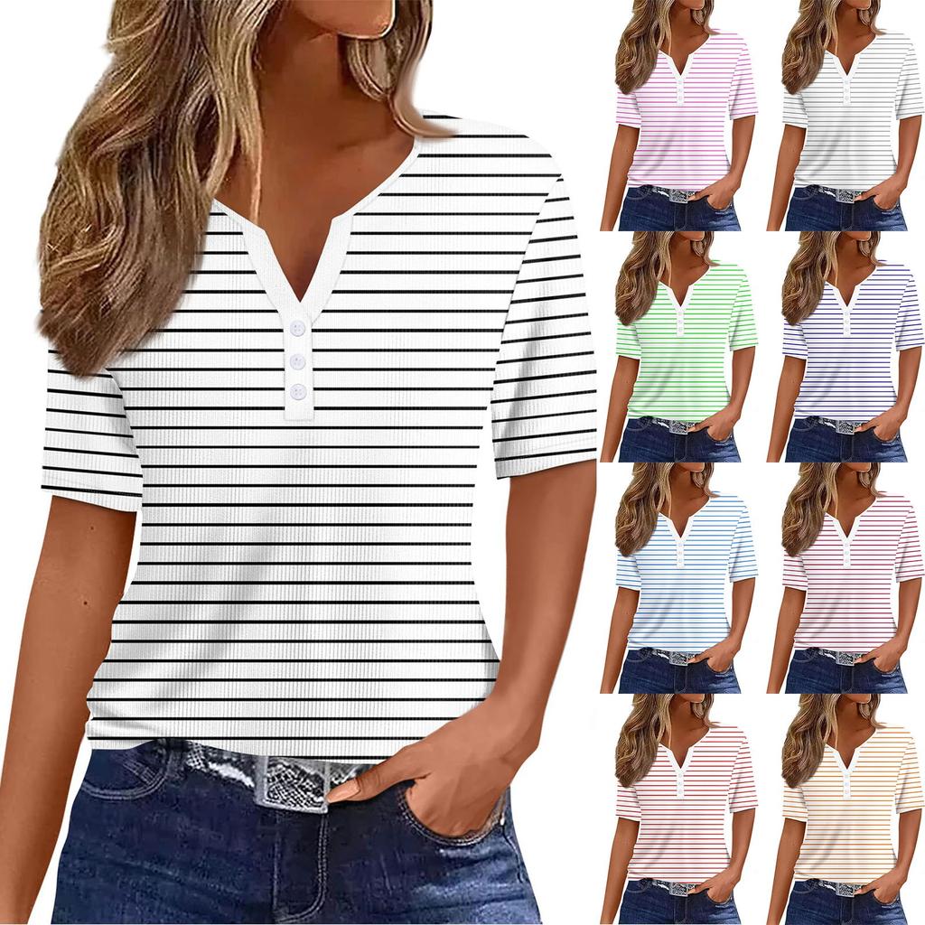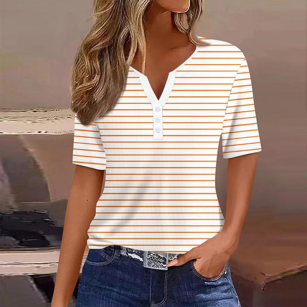 Женская повседневная футболка с коротким рукавом и V-образным вырезом, декоративная отделка пуговицами