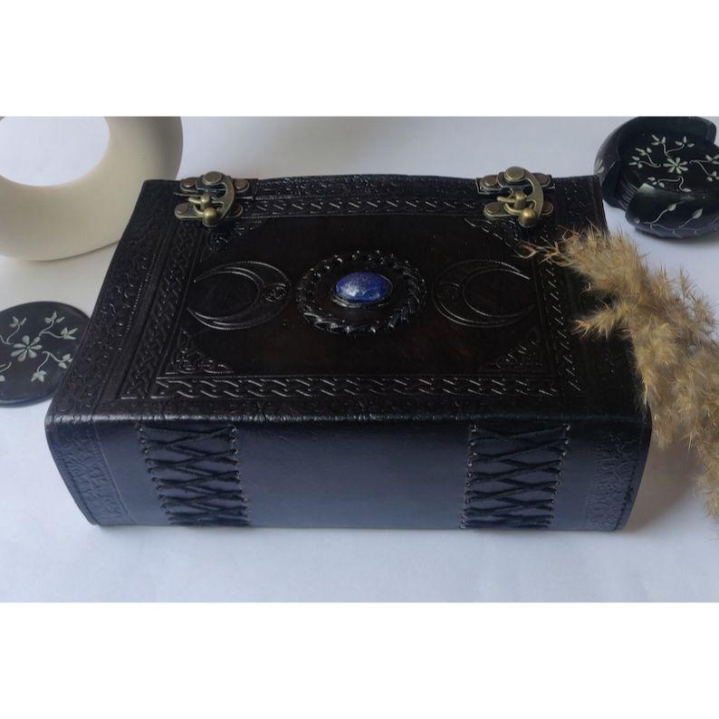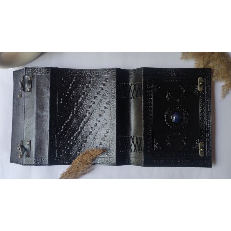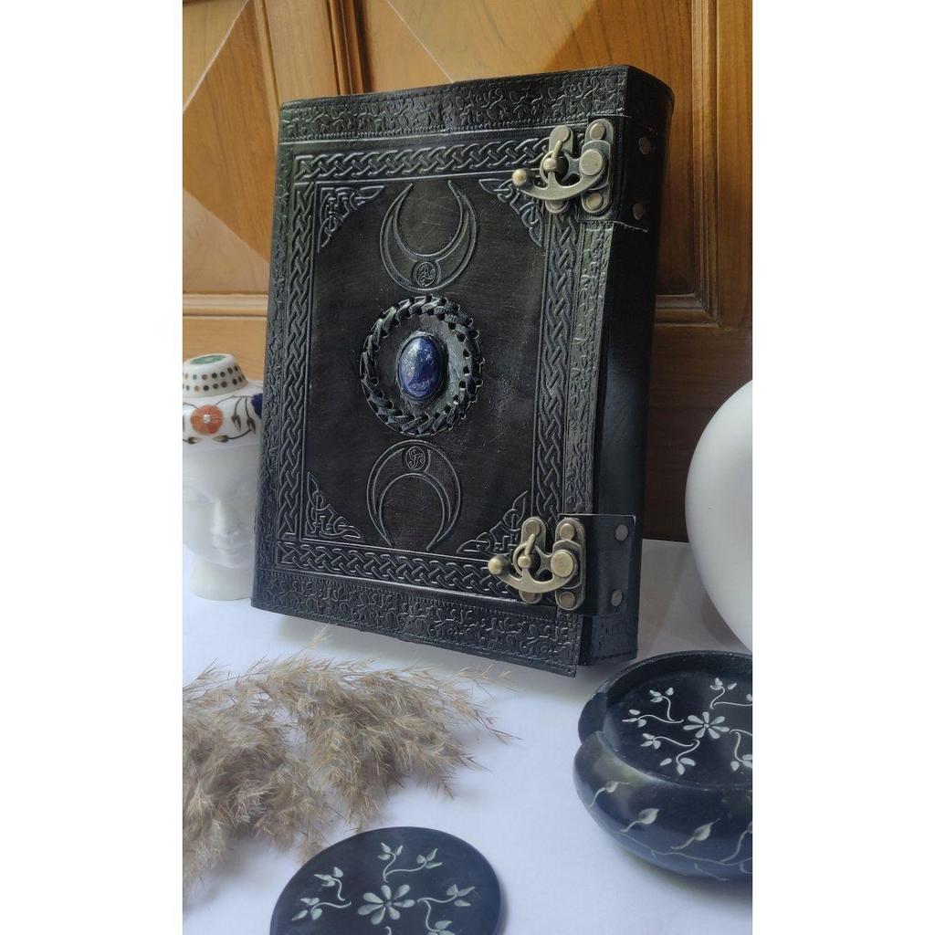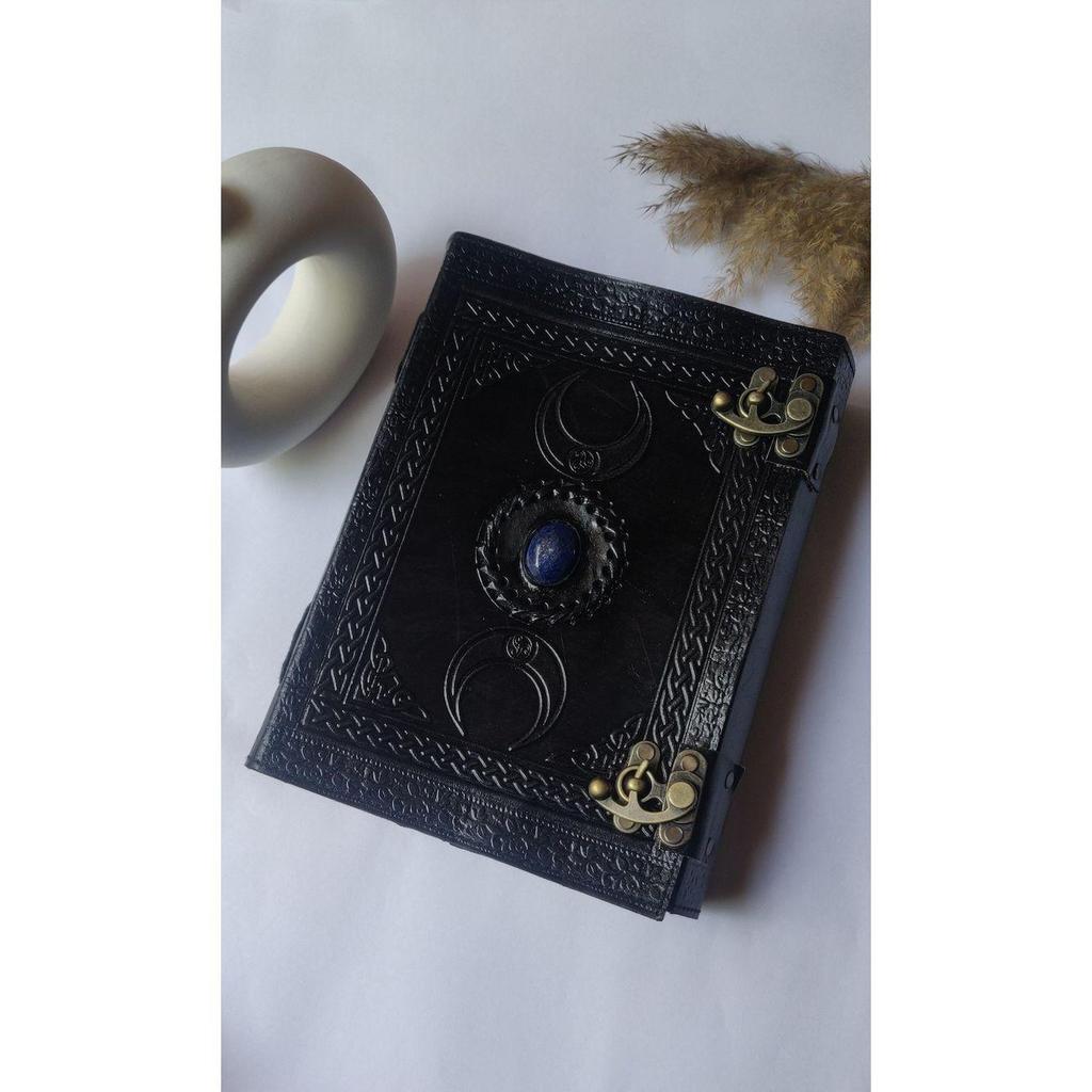 Этот красивый журнал / блокнот ручной работы с тройной луной и одним камнем изготовлен из гладкой и линованной бумаги, переплетенной натуральной кожей.