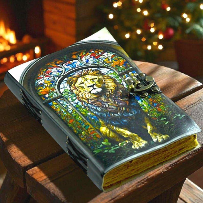 Большой кожаный журнал с львом: Винтажный гримуар, пустая Книга Теней