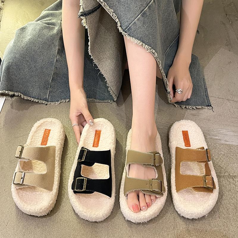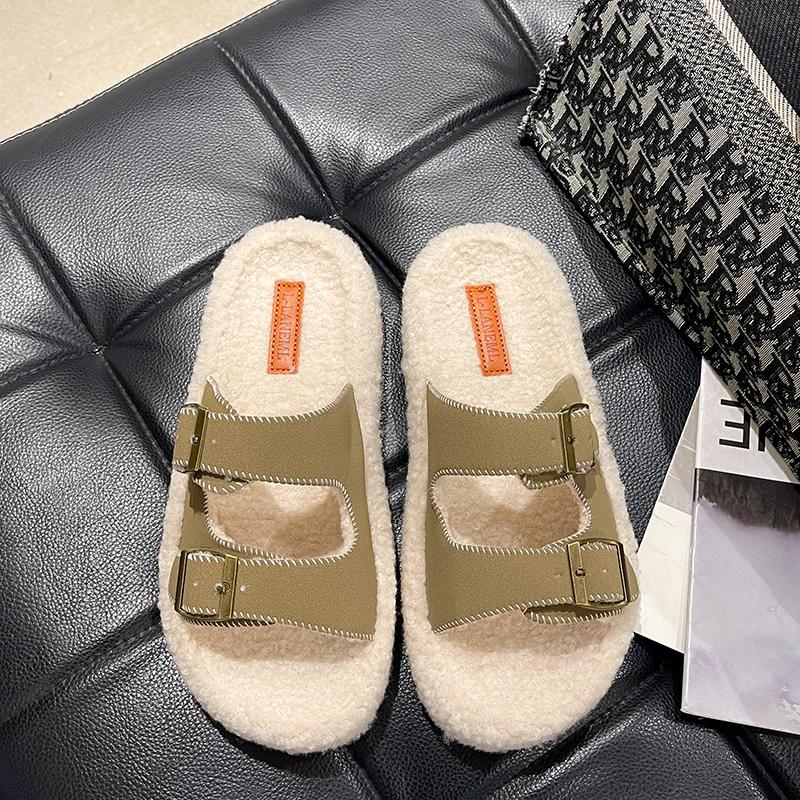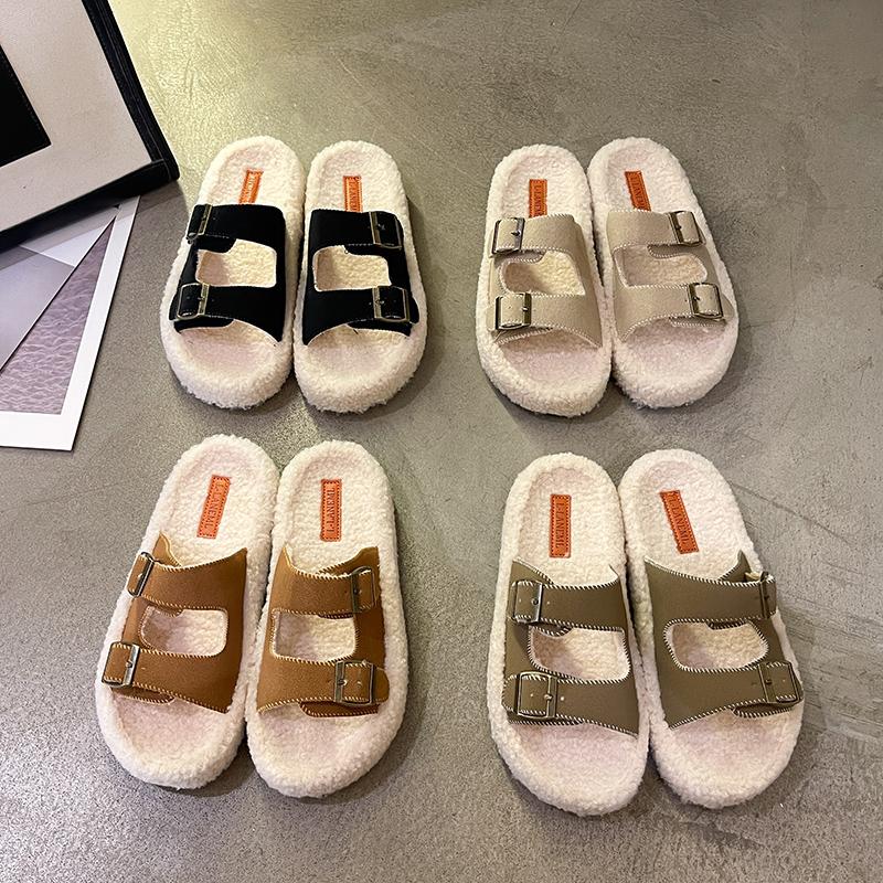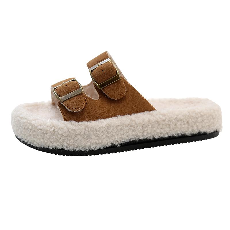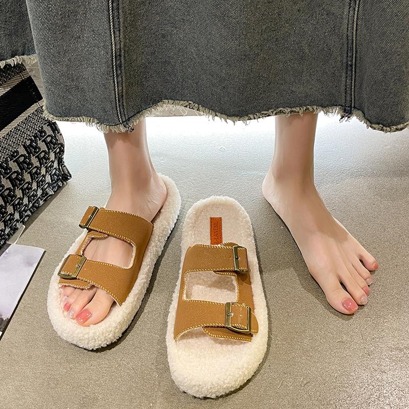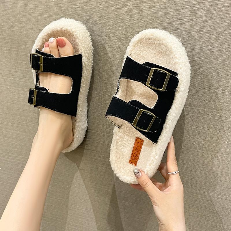 Модные женские тапочки Меховые плюшевые на платформе Носить Нескользящие тапочки Повседневная мода Пряжка-пины Римские шлепанцы Зимний новый стиль