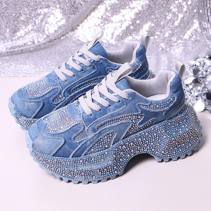 Модные роскошные кроссовки на массивной подошве со стразами для женщин, модные фиолетовые джинсовые туфли на платформе, спортивная женская обувь с нескользящей толстой подошвой, вулканизированная обувь
