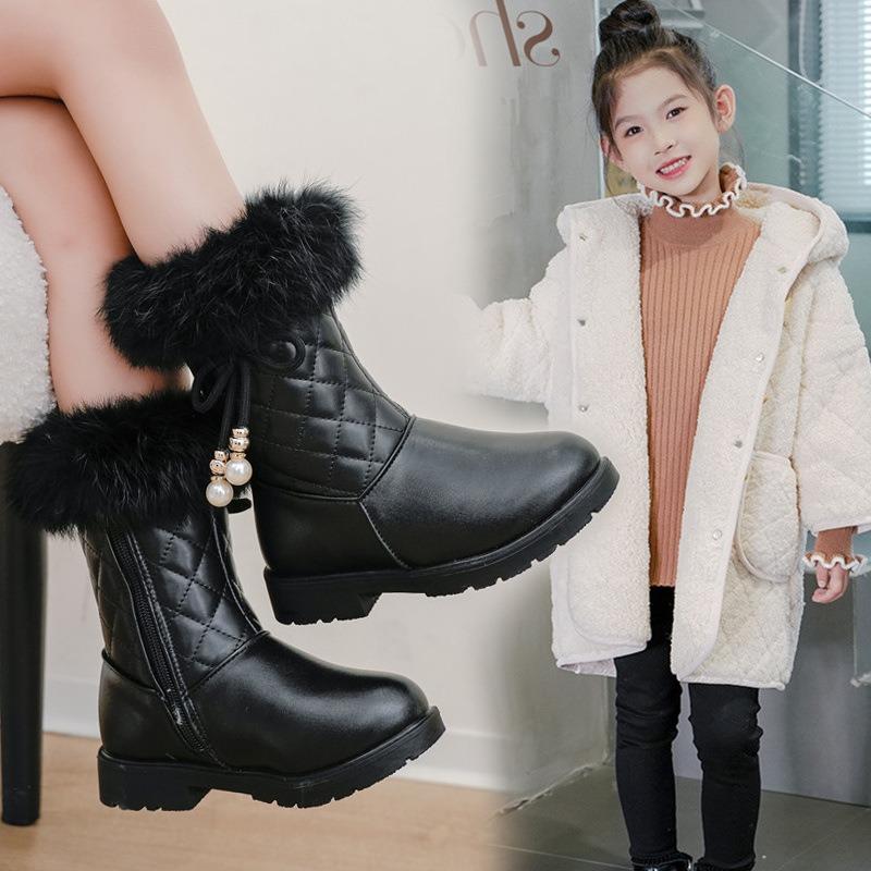Мода 2025 Зимние Теплые Кожаные Снежные Ботинки для Девочек с Бантом Детские Пинетки Мех Плюш Новая Мода ОБУВЬ Детские Принцесса До середины икры