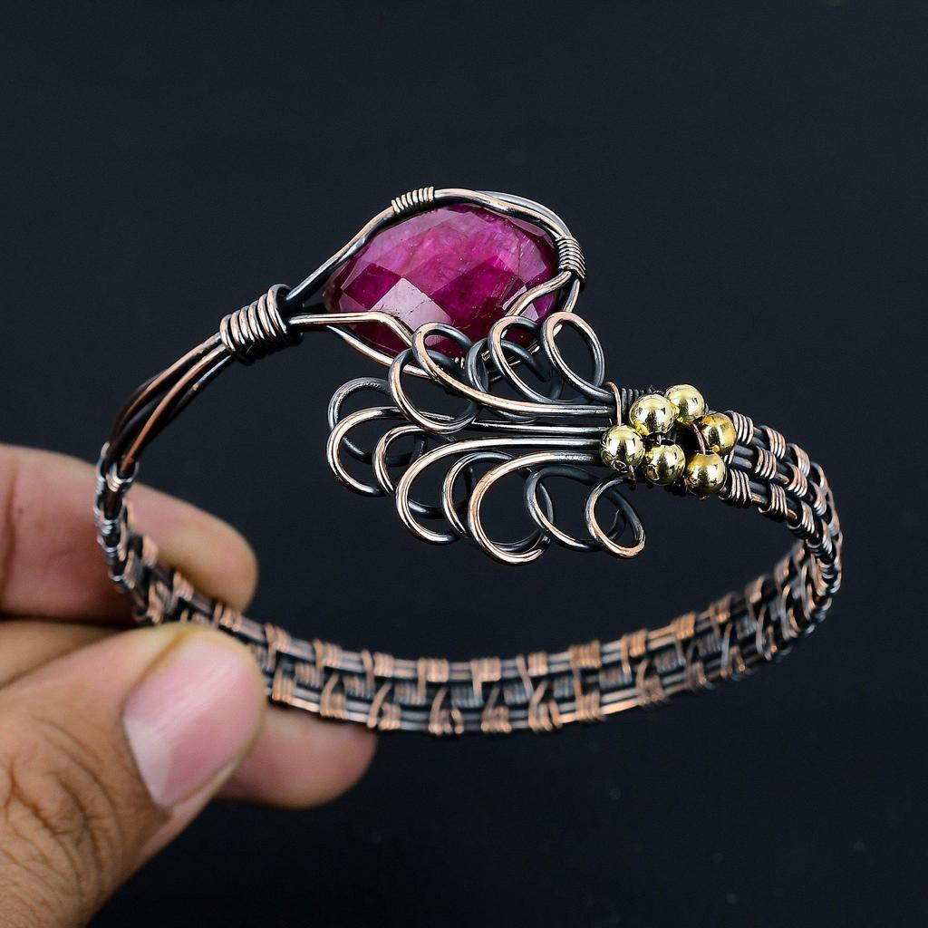 Рубиновый браслет-манжета из меди 999 пробы, обмотанный проволокой, регулируемый браслет с драгоценными камнями, подарок для мамы, ручная работа, новые украшения