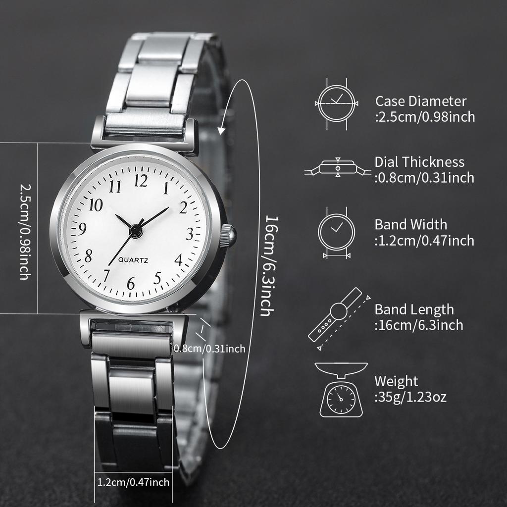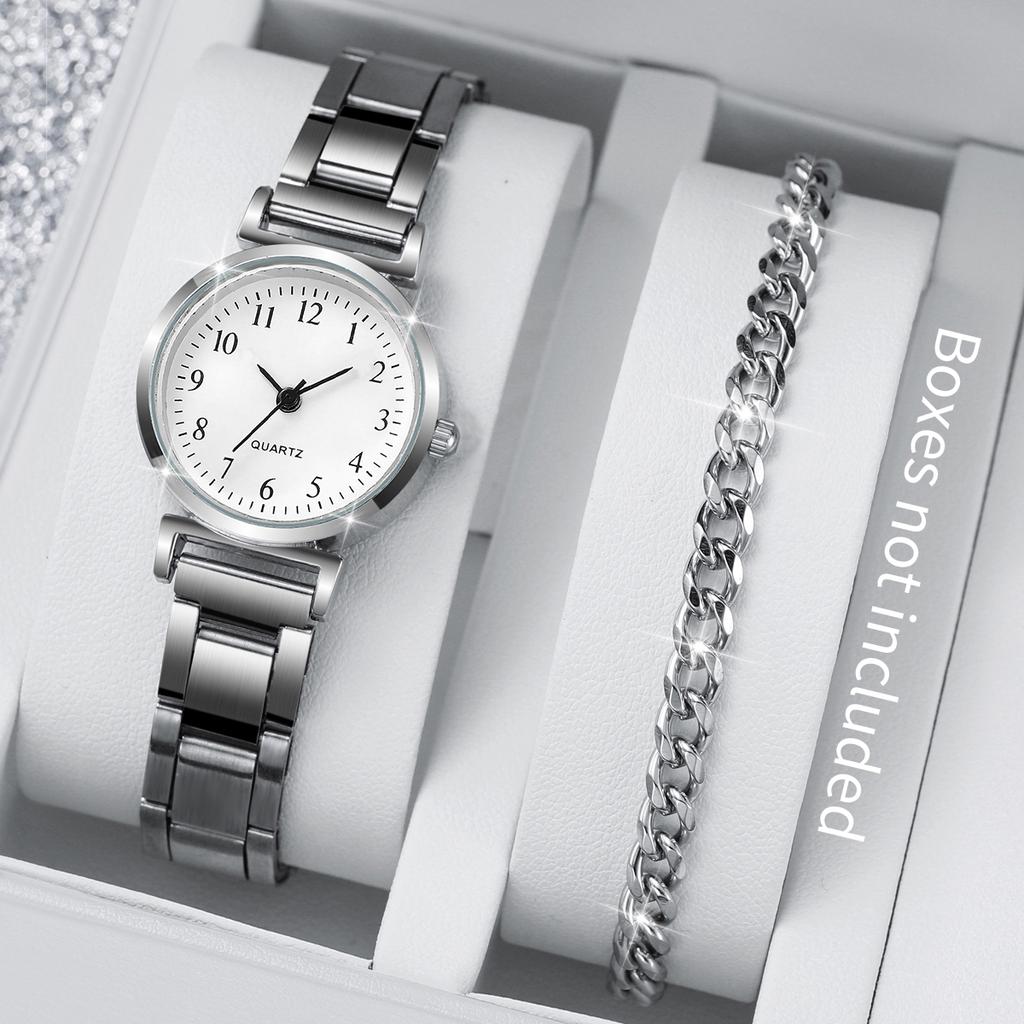2 шт./компл. Женские часы Модные с круглым циферблатом Ремешок из нержавеющей стали Кварцевые часы с серебряным браслетом