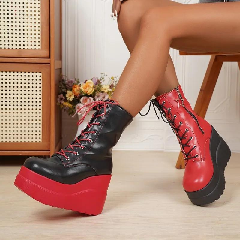 Мода 11 см Новый Дизайн Женские Панк Готические Мотоциклетные Ботинки Платформа Массивный Высокий Каблук Ботильоны Женские Крутые На Танкетке Черные Красные Женские Туфли