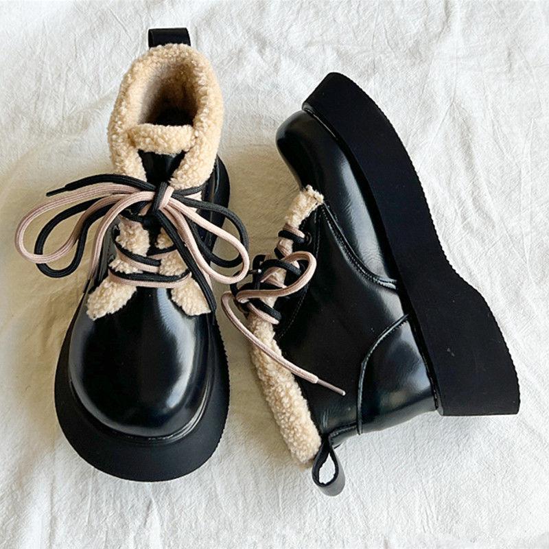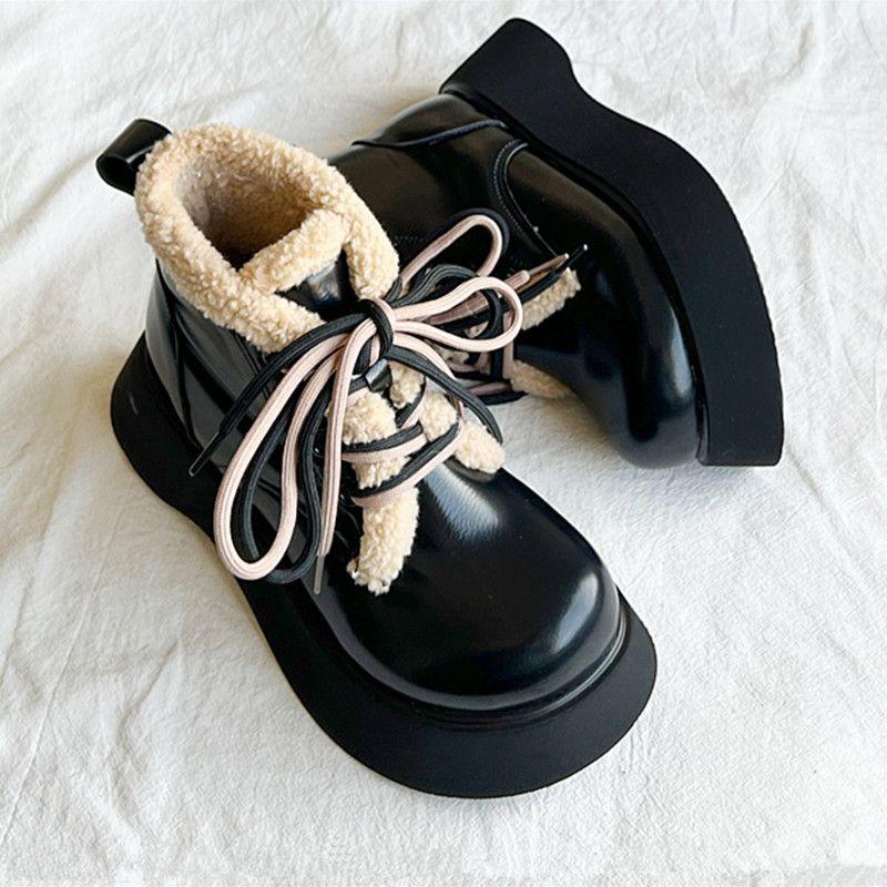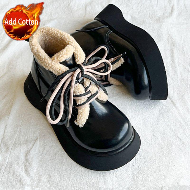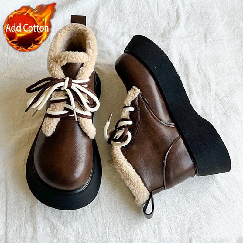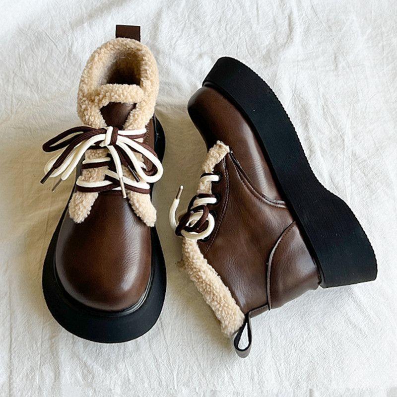 Модные ботинки-дутики на шнуровке с круглым носком для женщин, кожаные плюшевые ботильоны, удобная и элегантная обувь, осенне-зимняя женская обувь