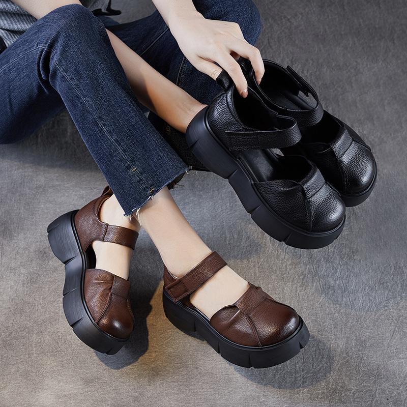 Модные 5 см Ручной работы Ретро Платформенные Сандалии Женские Летние Туфли на Танкетке Круглый Носок Натуральная Коровья Кожа Комфортные Универсальные Сандалии
