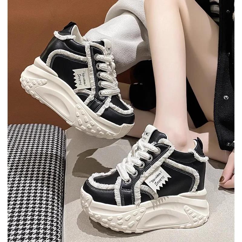 Модные осенние женские туфли на платформе, танкетка 10 см, повседневная обувь, увеличивающая рост, белые черные кроссовки, женская кожаная обувь, новинка