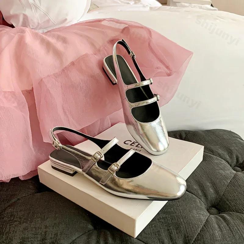 Модные женские балетки серебристые туфли Мэри Джейн женские летние новые кожаные Мэри Джейн ремешок модные с квадратным носком неглубокие элегантные балетки лодочки