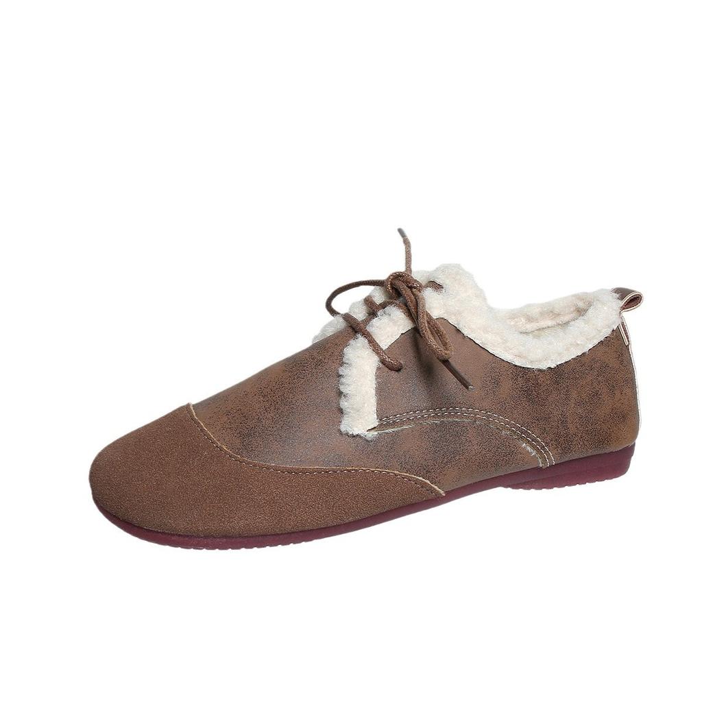 Модные женские туфли большого размера в стиле ретро из бархата, теплые, на плоской подошве, одинарные, на шнуровке, с круглым носком, пушистые хлопковые туфли для женщин на зиму 2024 года