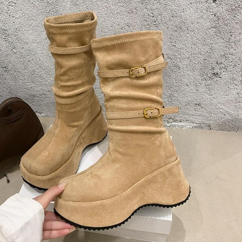 Модные женские замшевые полусапоги на платформе 2025 Зимняя модная обувь Дизайнерские элегантные новые длинные сапоги Повседневные уютные Zapatillas De Mujer