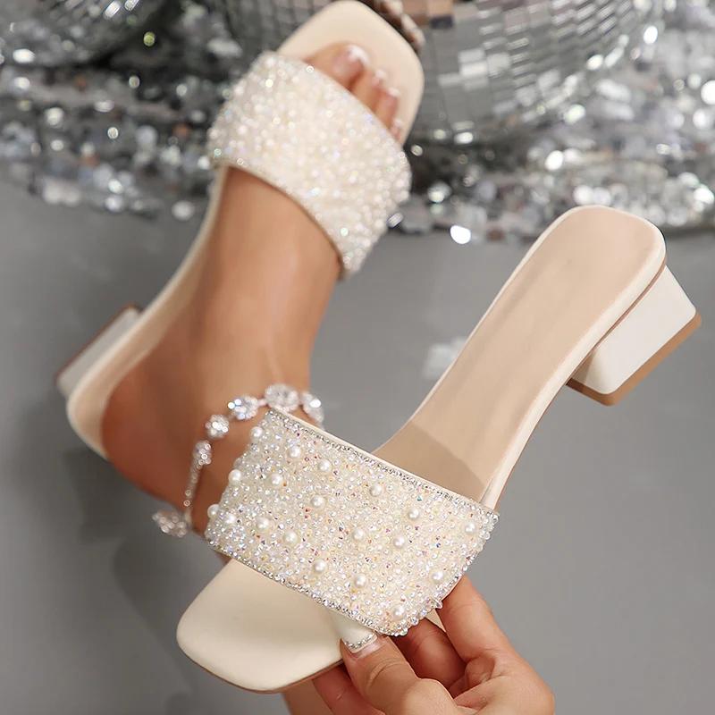 Модные сандалии на массивном каблуке с жемчужным декором Женские модные летние шлепанцы с квадратным носком Женские удобные слипоны большого размера Sandalias Mujer 2025