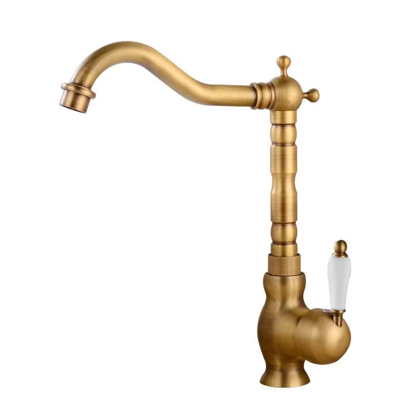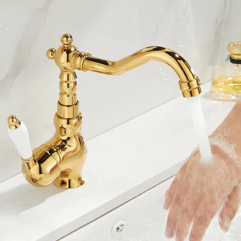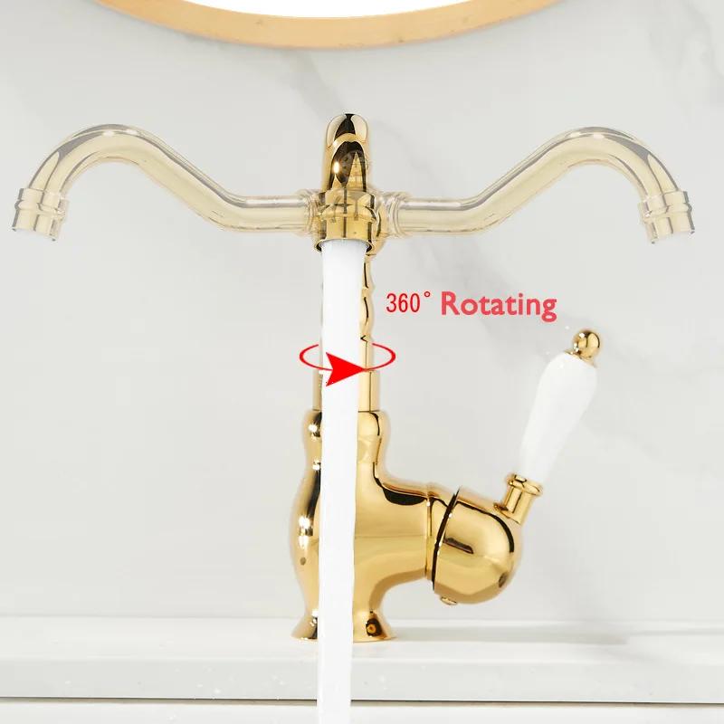 Европейский стиль Золотой смеситель для раковины Хромированные смесители горячей и холодной воды Антикварный смеситель для раковины Краны Вращающийся на 360 градусов кухонный смеситель