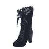 Мода Модные Полусапожки Средней Длины 2024 Осень Зима Новый Дизайн Чувство Кружево Женские Кожаные Сапоги на Высоком Каблуке Большие Размеры Zapatos Mujer