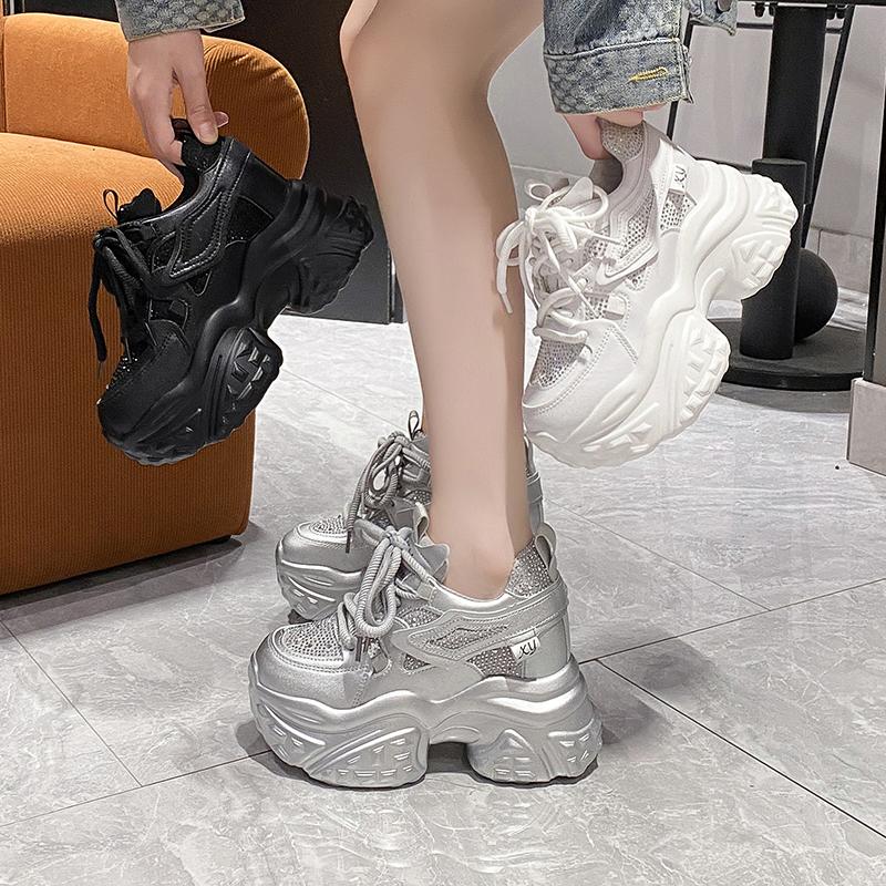 Мода 10 см Женские Повседневные Кроссовки на Платформе на Высоком Каблуке 2025 Новая Осень Спортивная Кожаная Обувь Блестящие Кроссовки Массивные Кроссовки Zapatos Mujer