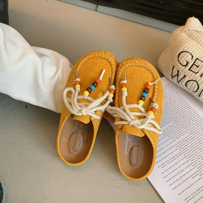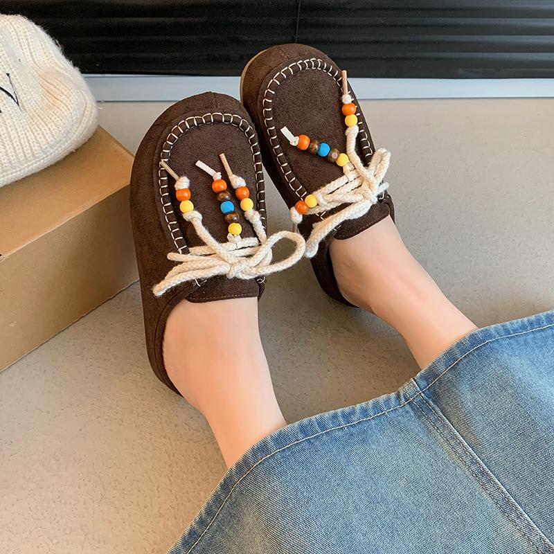 Модные женские туфли на плоской подошве с закрытым носком, ремешком сзади, шнуровкой, бусинами, слипоны на внутренней платформе, универсальные ретро-замшевые женские туфли