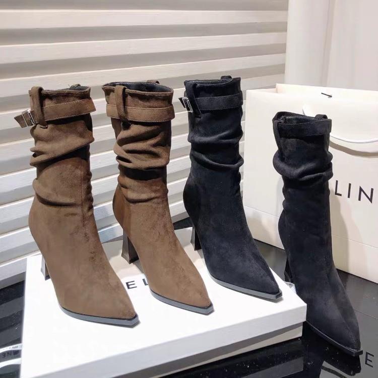 Мода Мода Пряжка для ремня Современные ботинки Женские 2025 Высокое качество Женская обувь Слипоны Женские ботинки Сексуальный острый носок Сапоги до колена