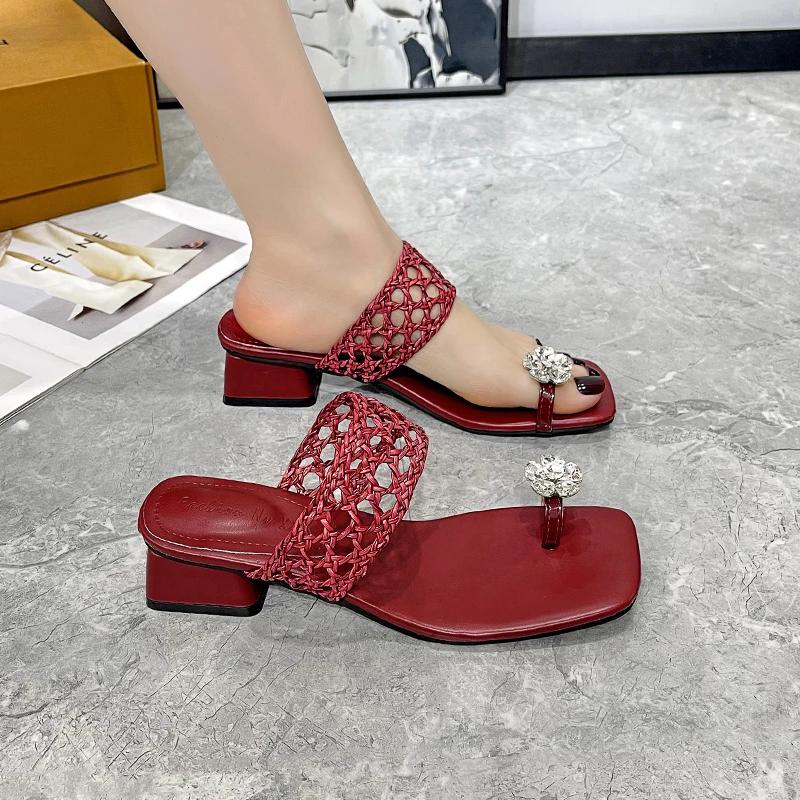 Мода 2025 Лето Горячая Распродажа Босоножки-вьетнамки на среднем каблуке с квадратным носком, украшенные стразами и ажурным плетением, нарядные, для улицы, женская классика, модные шлепанцы