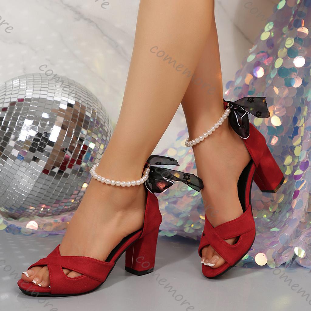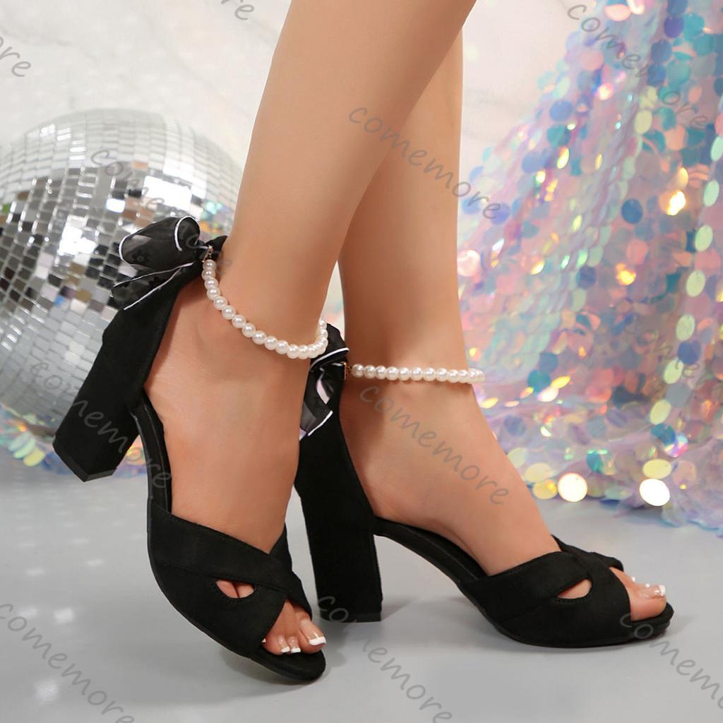 Fashion Comemore 7cm Thick Heeled Shallow Mouth Suede Women Sandals Sexy High Heels Fashion Open-toe Pearl Ankle Buckle Females Sandales