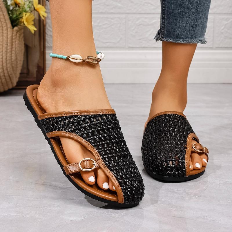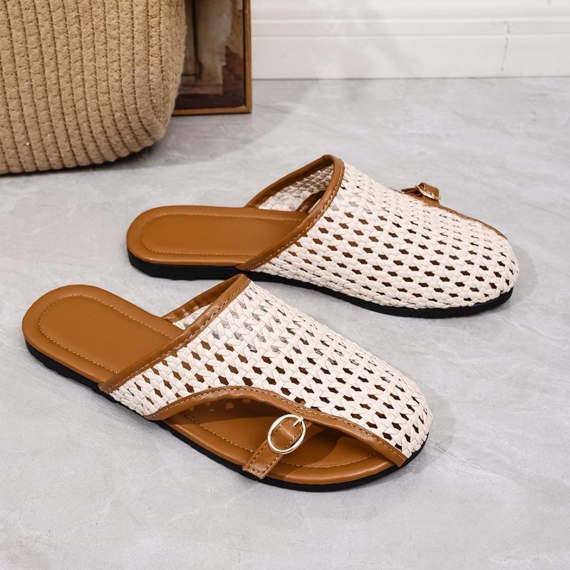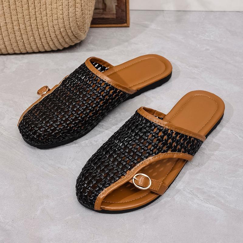 Модные шлепанцы на плоской подошве, летние новинки, с круглым носком, глубоким вырезом, металлической пряжкой, сетчатым верхом, мягкой подошвой, противоскользящие, износостойкие сандалии