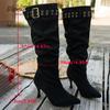 Модные ботфорты на высоком каблуке с ремешком с пряжкой для женщин, модные туфли для вечеринок с острым носком и каблуком-стилетом, женские ботфорты до колена с плиссированным дизайном