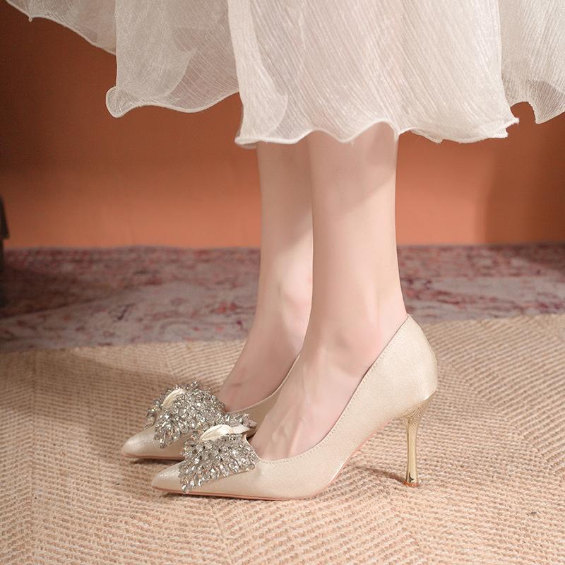 Модные Темпераментные Высокие Каблуки Женские Осенние Новые Остроносые С Мелким Вырезом Блестящие Стразы Бант Шпилька Одиночные Туфли