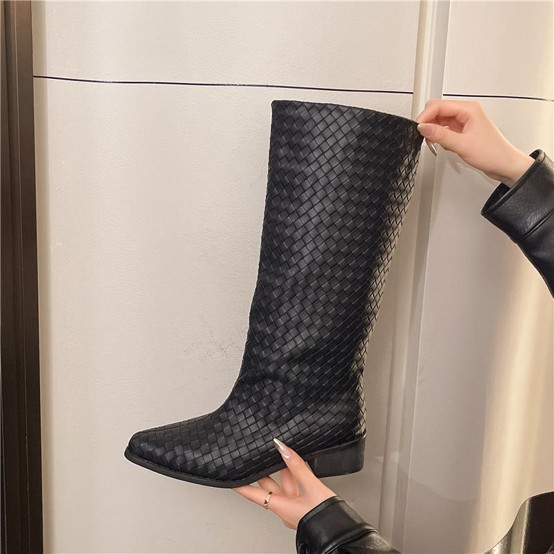 Модные ботфорты до колена Женские остроносые слипоны Плетеные с высоким голенищем Высокий противоскользящий износостойкий блочный каблук Ботинки-чулки