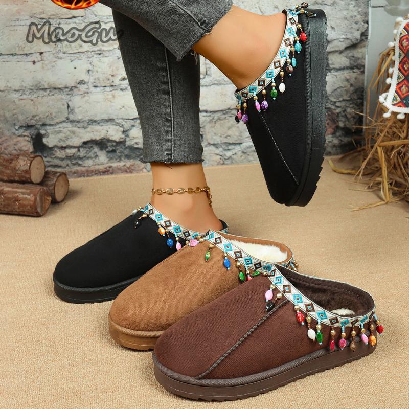 Fashion Bohemia Fringed Decoration Cotton Slippers Women 2025 Winter Comfort Thick Bottom Non Slippers Warm Short Plush Slides Size36-44 — купить товар онлайн с бесплатной доставкой по всему миру!