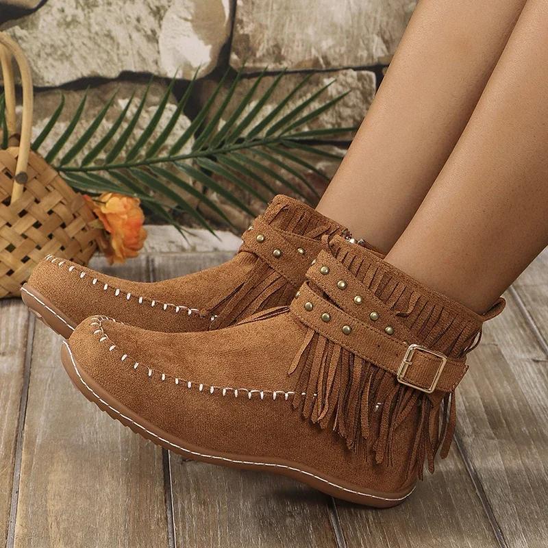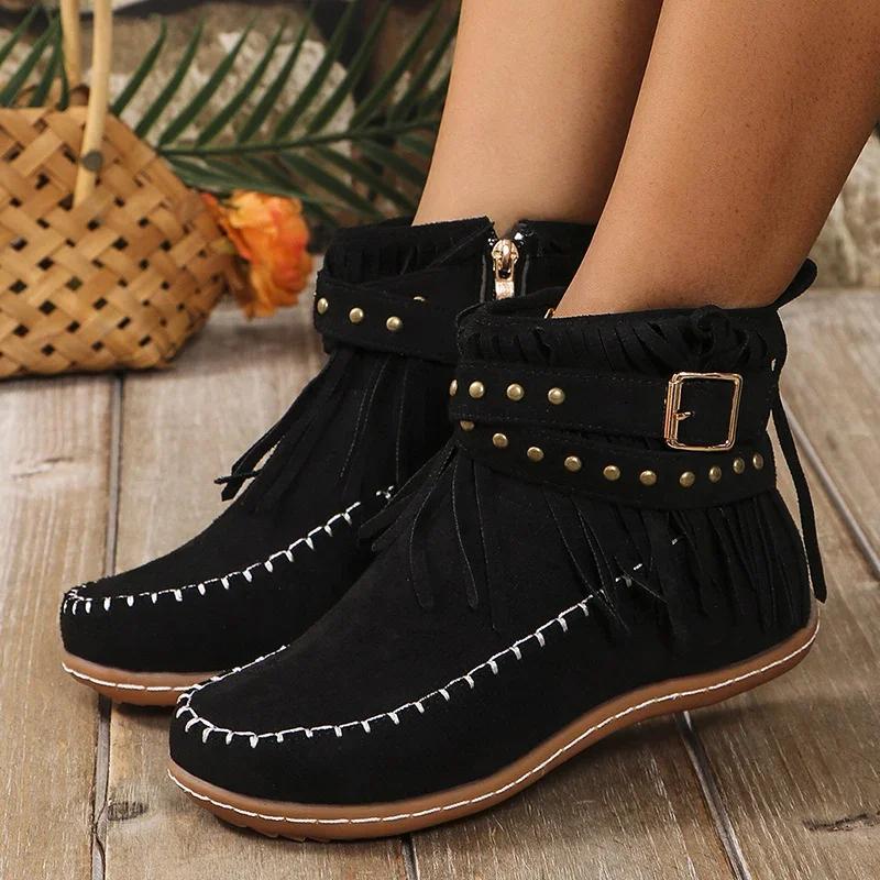 Модные винтажные ботинки-вестерны с кисточками для женщин, украшенные заклепками, на плоском каблуке, ботильоны до щиколотки, женский размер, на молнии, нескользящие короткие ботинки