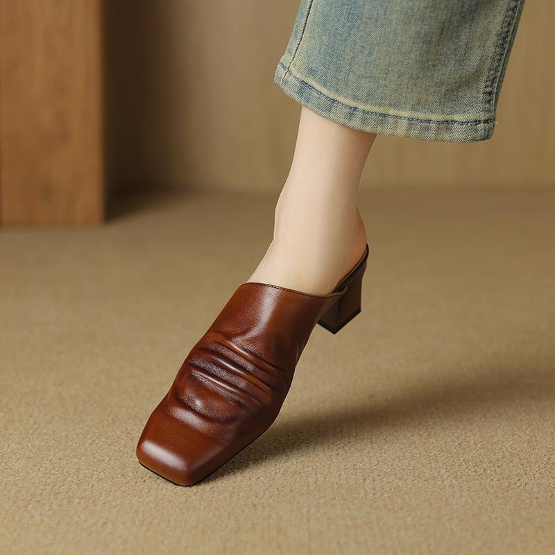 Мода 2025 Лето Новая Натуральная Кожа Ретро Полу-драг Мюли Женские Женские Высокий Каблук Квадратный Носок Повседневная Обувь Женские Шлепанцы