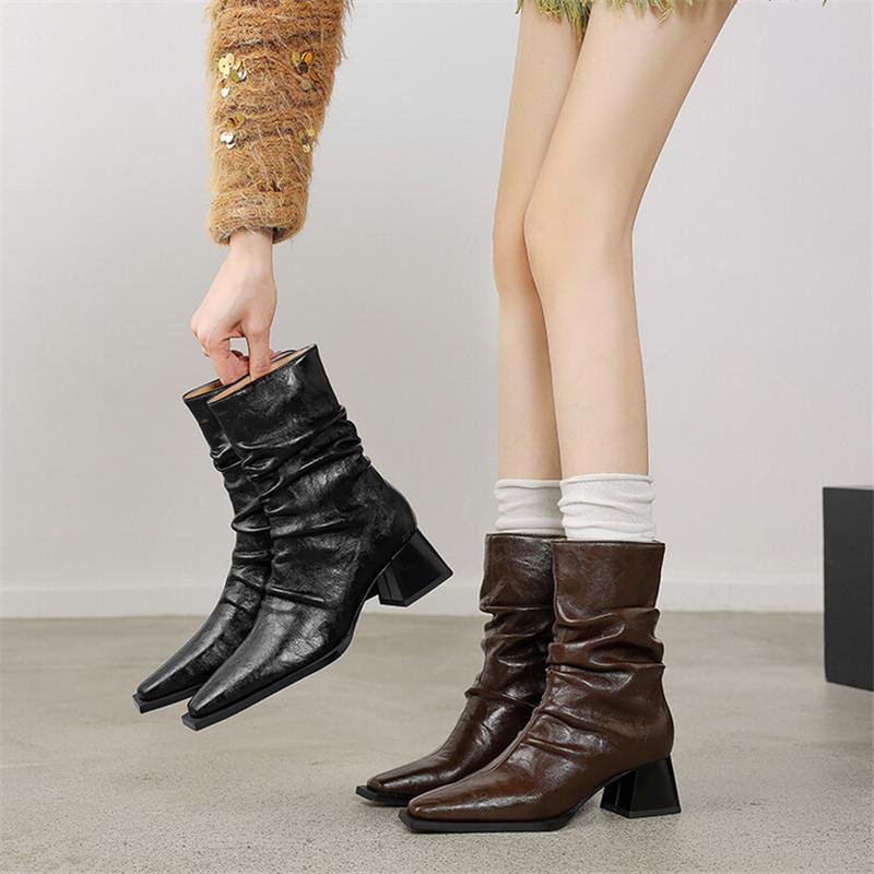 Fashion New Autumn Winter Women Boot Fashion Pleated Square Toe Boots for Women Short Boots Ladies Shoes Western Boots Zapatos Mujer