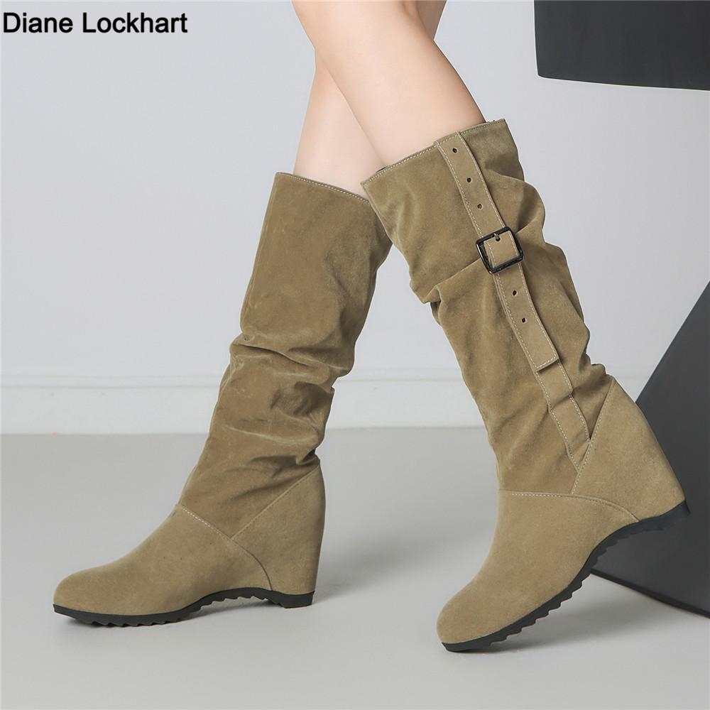 Модные женские ботинки до середины икры с внутренней платформой, женская обувь высокого качества, новые, с круглым носком, однотонные, в английском стиле, модные, повседневные, с пряжкой, плиссированные — купить товар онлайн с бесплатной доставкой по всему миру!