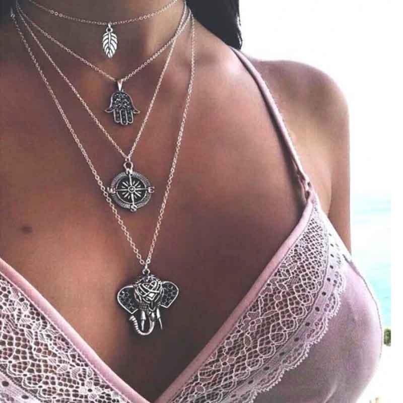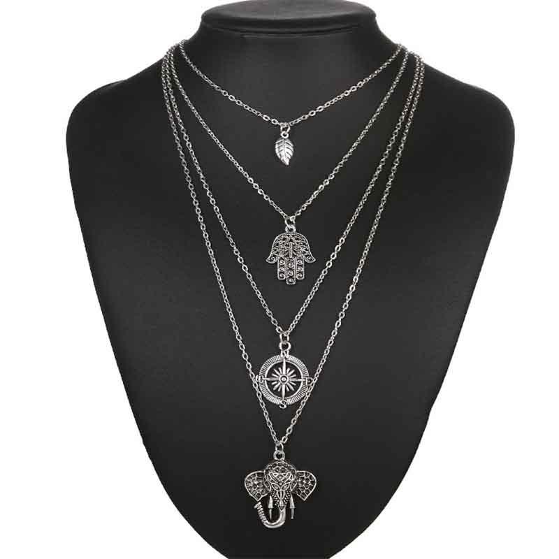Boho Punk Fashion Retro Alloy Palm Sun Multilayer Necklace Leaf Pendant Elephant