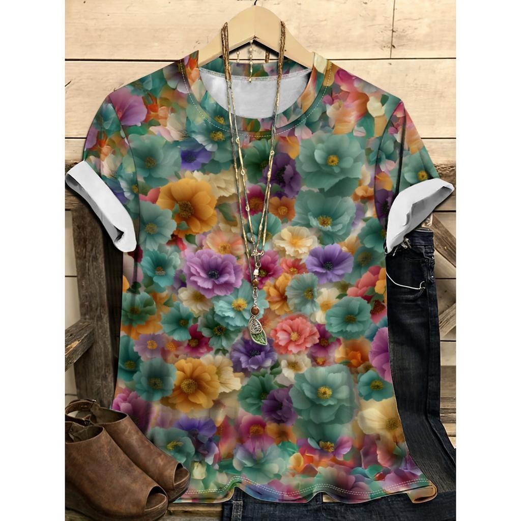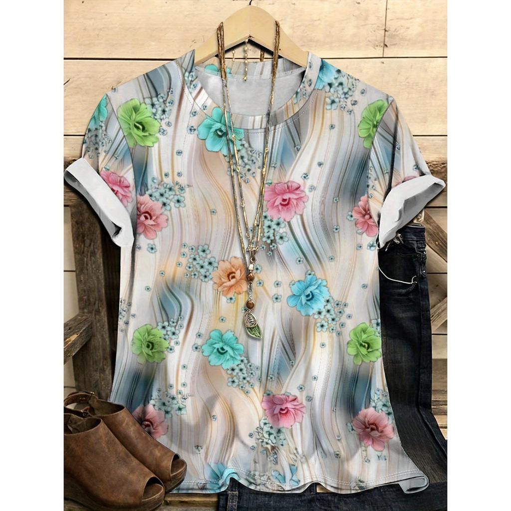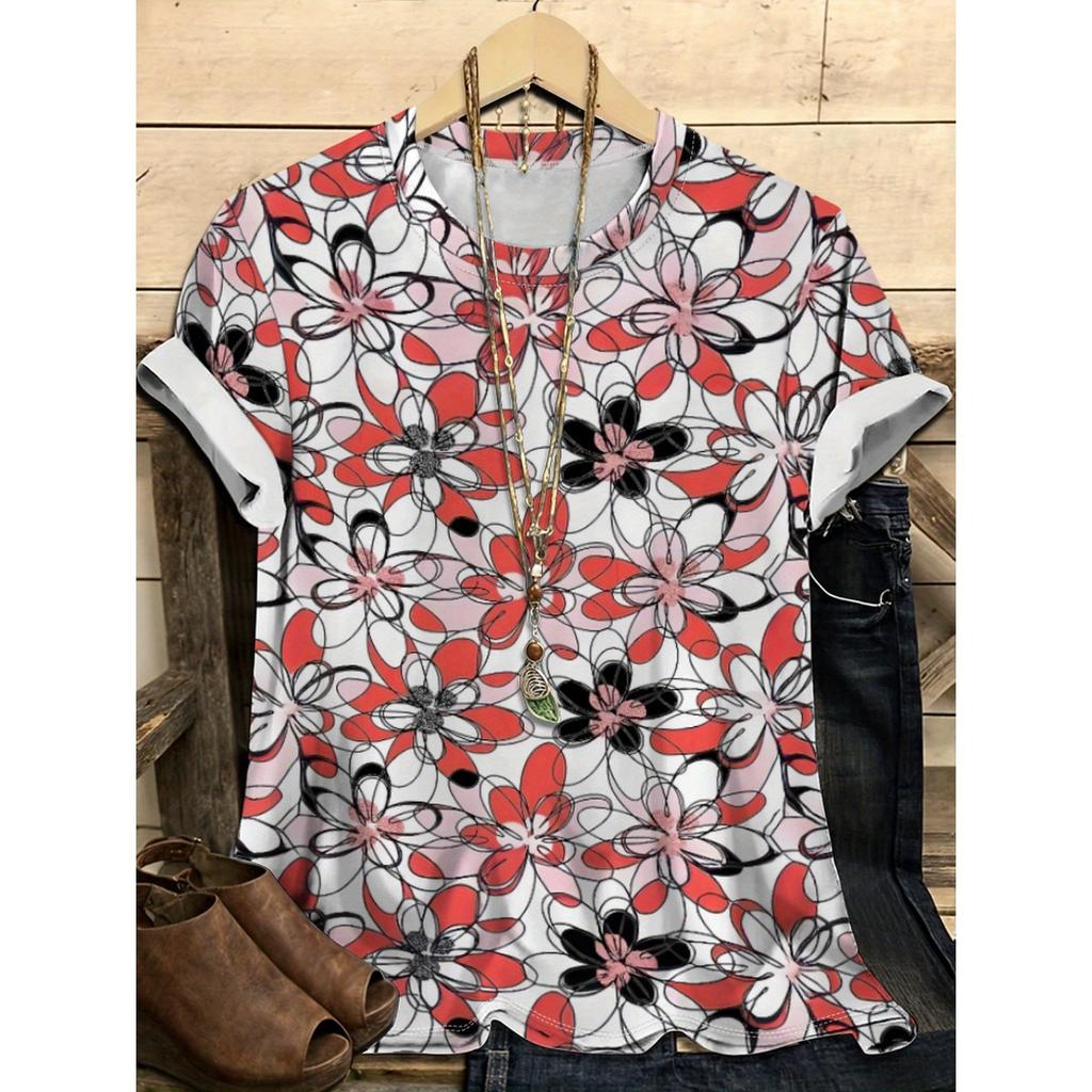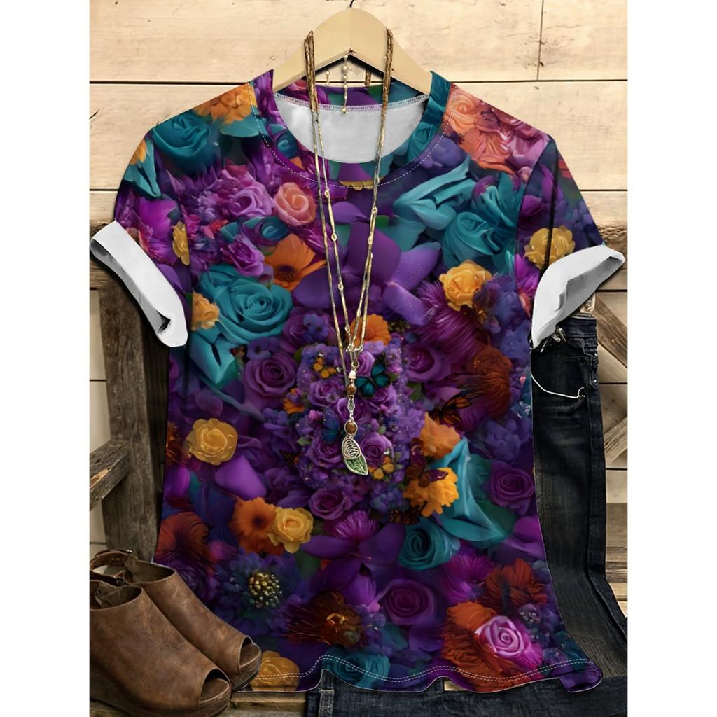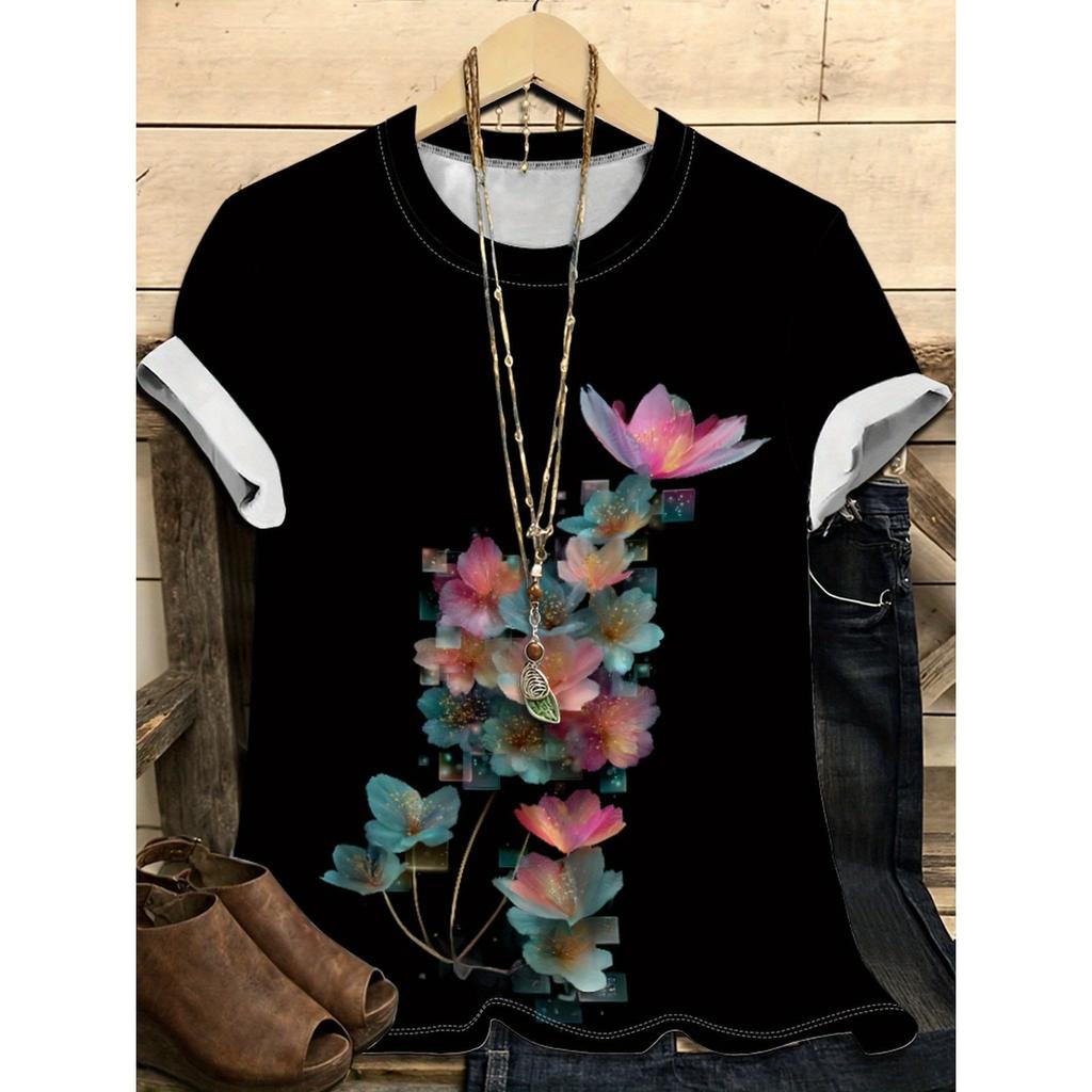 Летний топ с круглым вырезом и цветочным узором с 3D-принтом, модная повседневная женская футболка с коротким рукавом