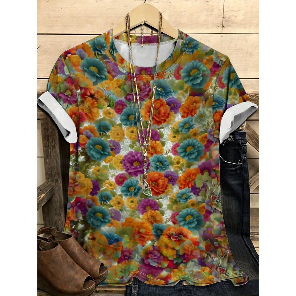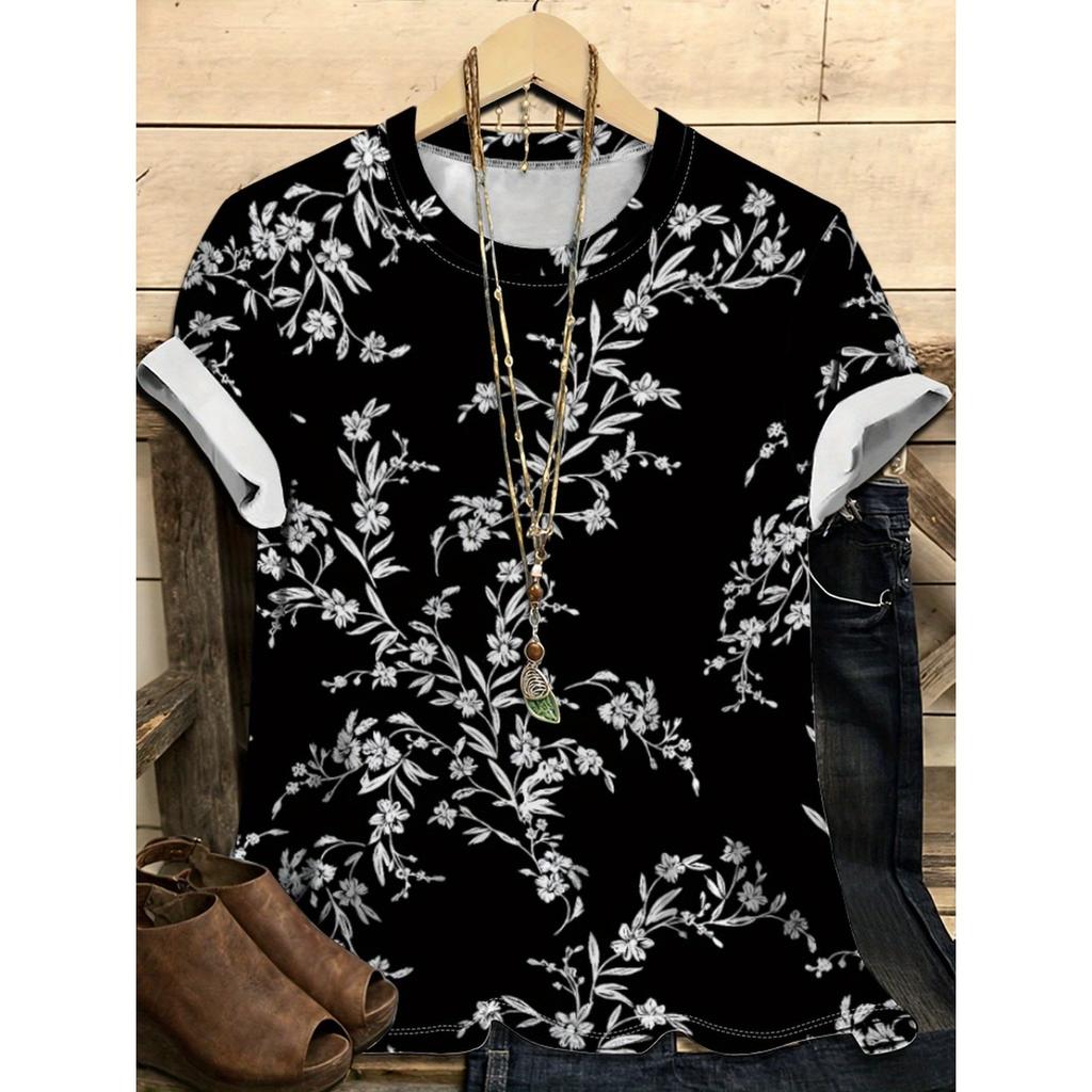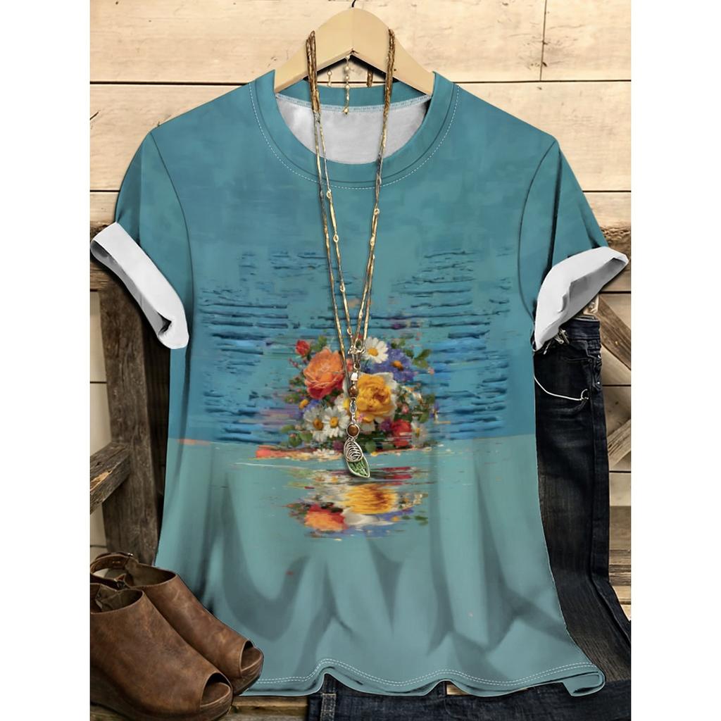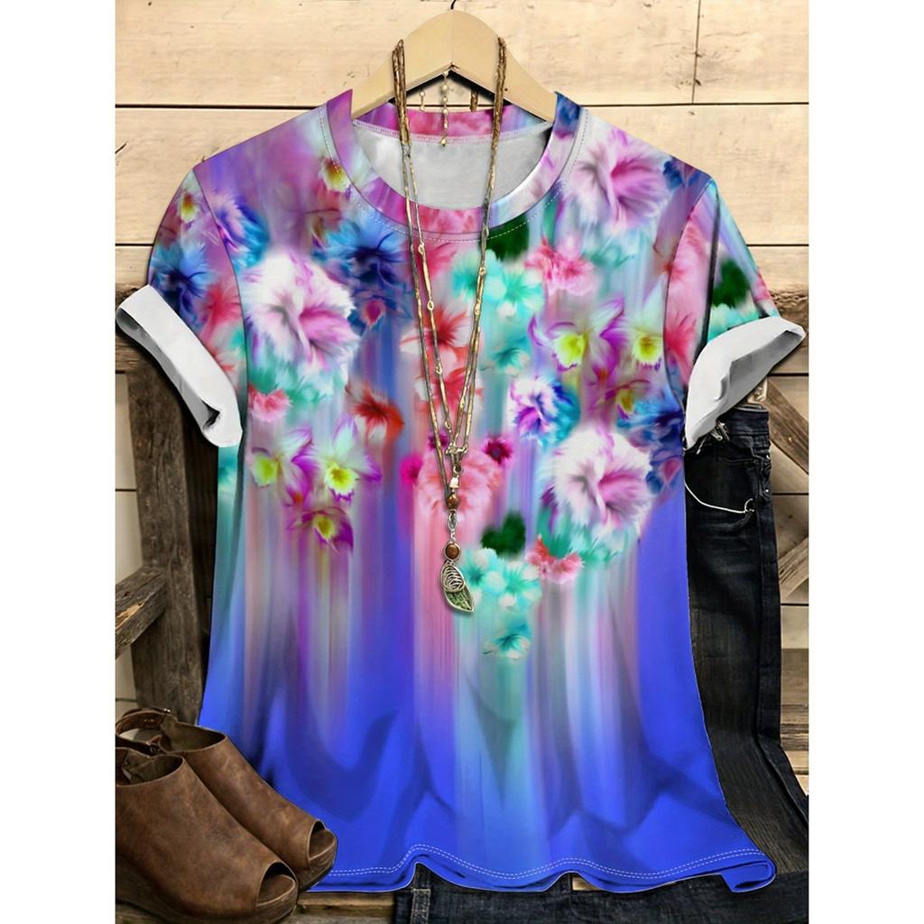 Летний топ с круглым вырезом и цветочным узором с 3D-принтом, модная повседневная женская футболка с коротким рукавом