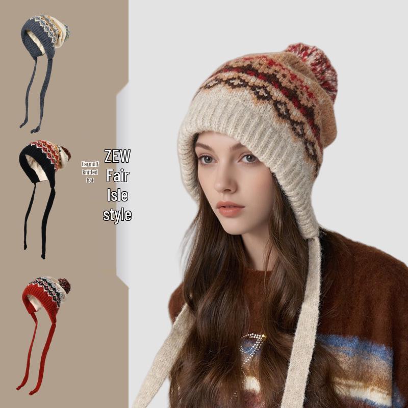 Женская вязаная шапка с помпоном в стиле Fair Isle - Ретро жаккардовая шерсть с защитой ушей для зимнего тепла