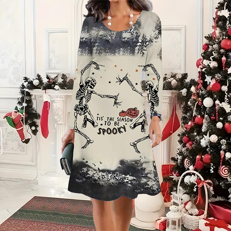 2025 Осень и Зима Новое Повседневное Женское Платье с Круглым Вырезом 3D Хэллоуинский Узор Идеальный Подарок на Хэллоуин Рождество