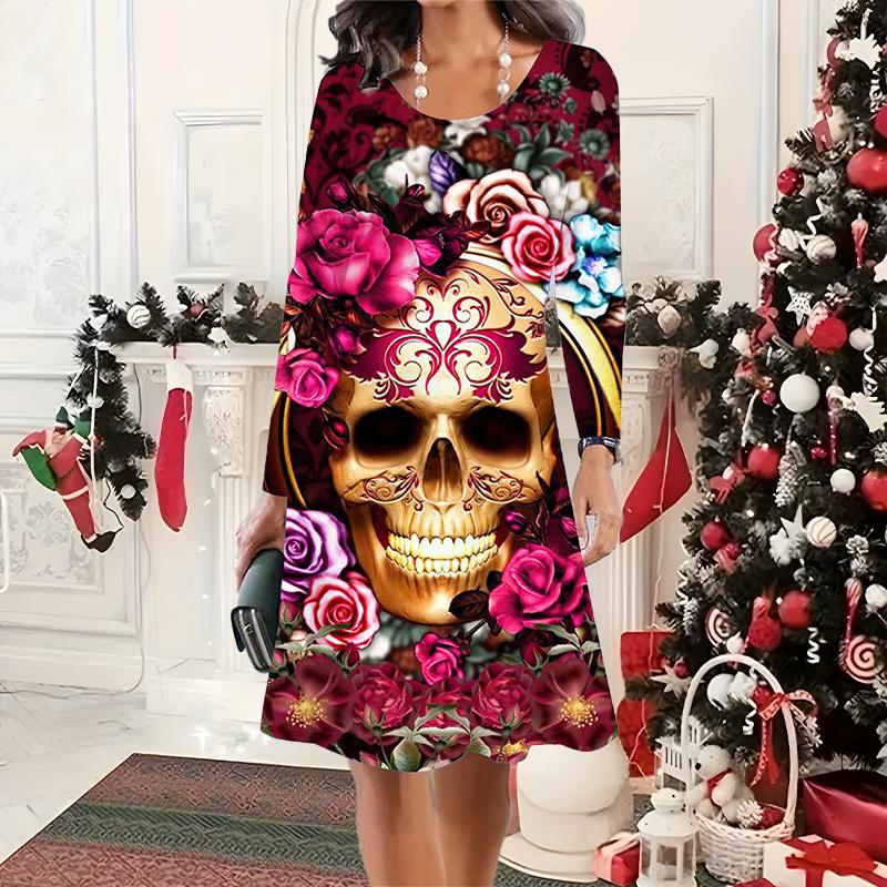 2025 Осень и Зима Новое Повседневное Женское Платье с Круглым Вырезом 3D Хэллоуинский Узор Идеальный Подарок на Хэллоуин Рождество