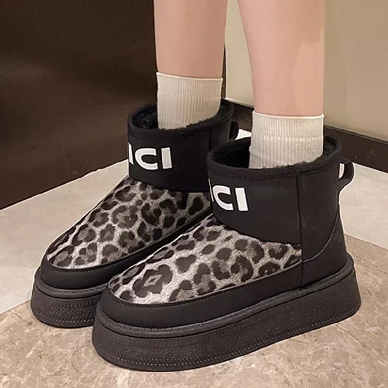 Модные леопардовые женские меховые зимние ботинки до щиколотки, на плоской подошве, на платформе, 2025, зимние, короткий плюш, теплые женские ботинки, спортивная обувь, женские ботинки челси