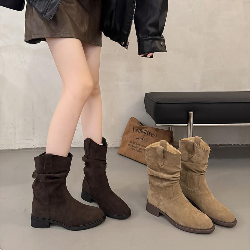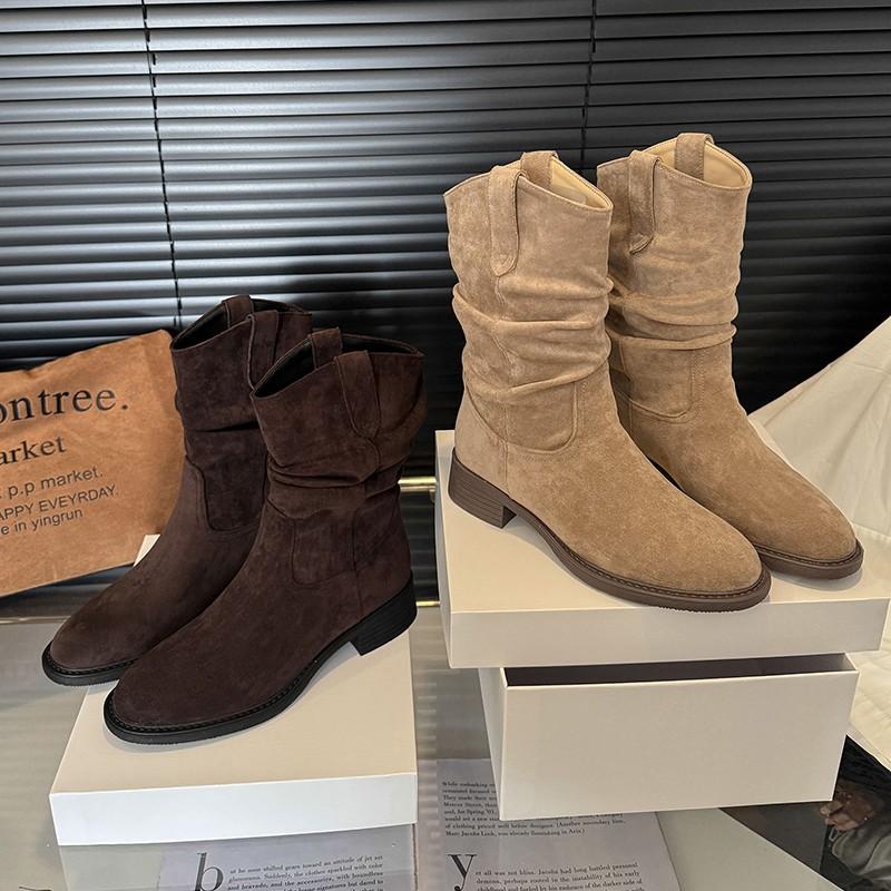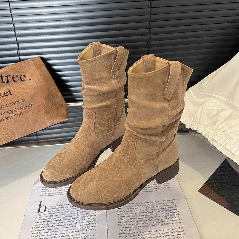Модные женские ботинки из натуральной замши нового стиля с узким квадратным носком, слипоны, осенние плиссированные ботфорты до колена, повседневные женские панк-вестерн ботинки