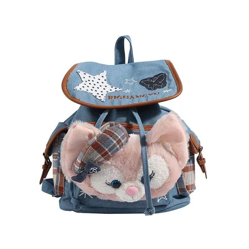 Этот рюкзак, изготовленный из прочной джинсовой ткани, поддерживает устройства до 12 дюймов.. Его очаровательный мультяшный дизайн с плюшевыми акцентами и красочной строчкой предлагает свежий, милый стиль.. Идеально для повседневного использования, удобно для прогулок или школьных мероприятий.. Протирайте влажной тканью для легкого ухода.