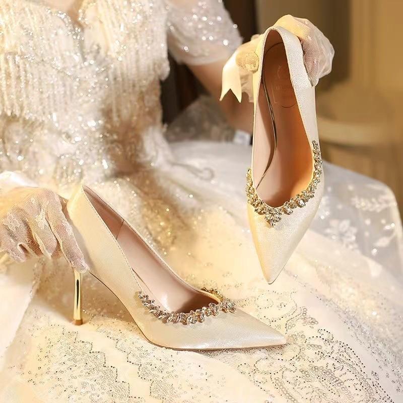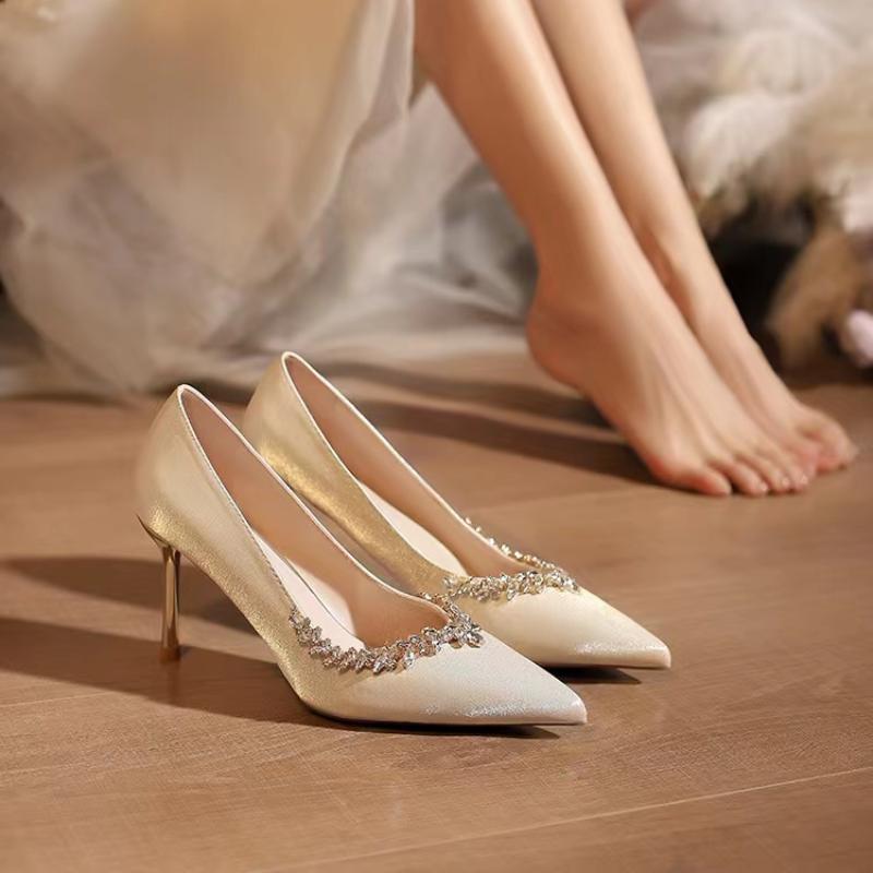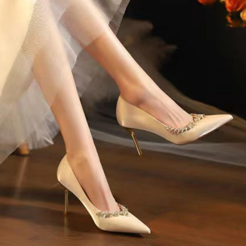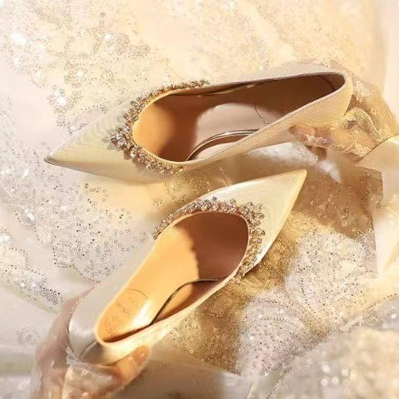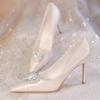 Мода 2025 Женские Новые Туфли на Тонком Каблуке Остроносые Французский Темперамент Стразы Одинарные Туфли Туфли Невесты Свадебные Туфли