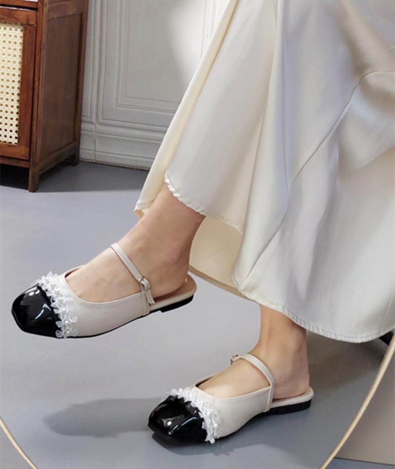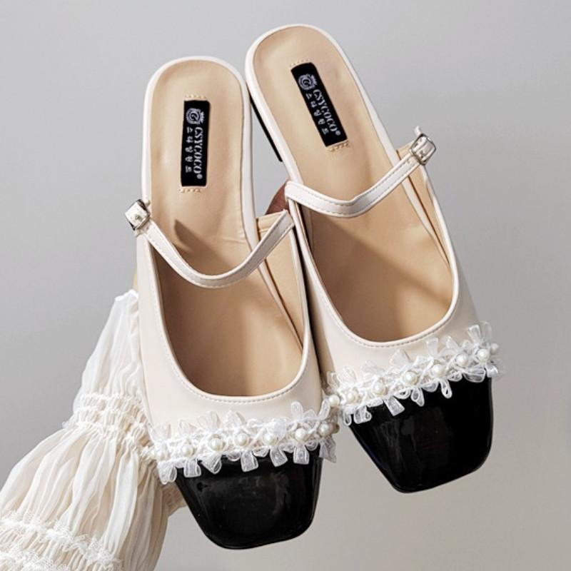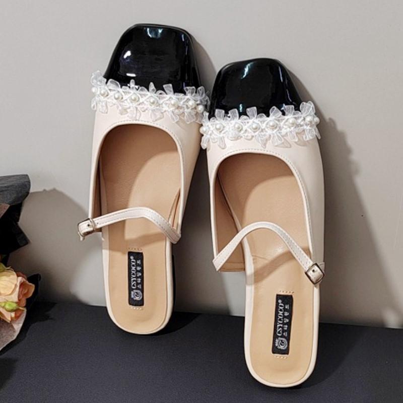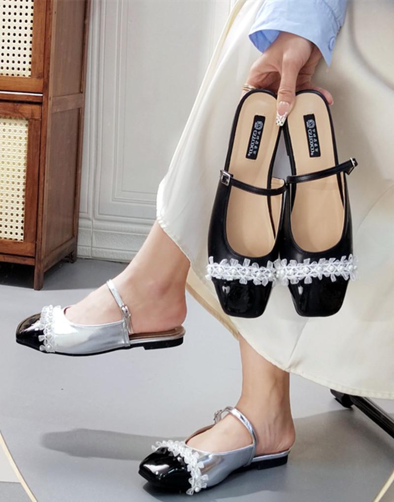 Fashion Elegant Lace Pearl Flat Sandals Women Square Toe Buckle patchwork Mary Jane Shoes Fashion Comfort Luxury Designer Brand Sandals