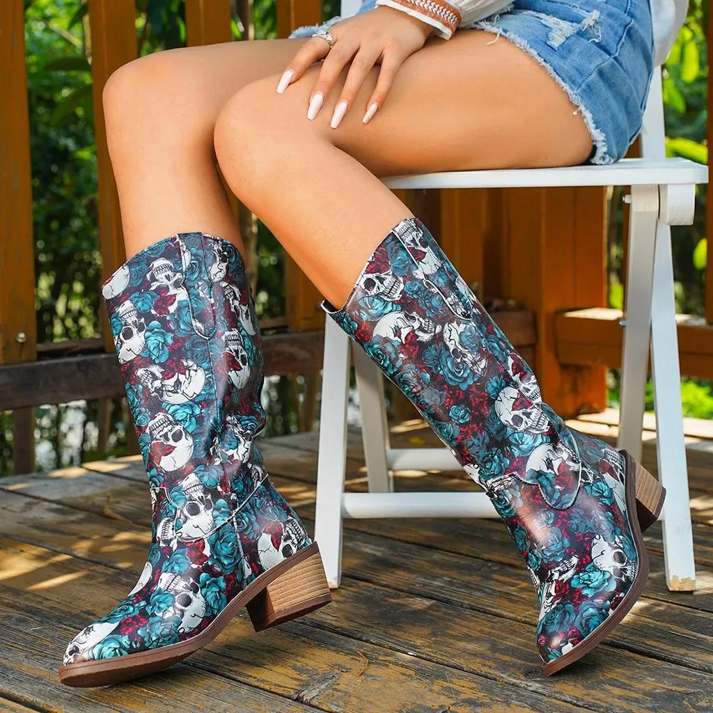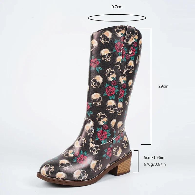 Мода Мода Принт Черепа Массивный Каблук Полусапоги до середины икры Женские Тема Хэллоуина Осенне-зимние Сапоги Женские Высокая Голенище Искусственная Кожа Сапоги Женские