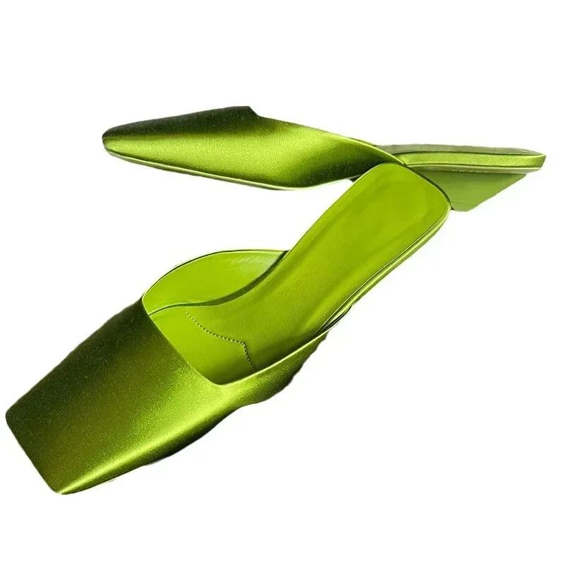 Модные Элегантные Зеленые Атласные Дизайнерские Шлепанцы Женские 2025 Летняя Мода Низкий Каблук Квадратный Носок Мюли Лоферы Роскошные Комфортные Шлепанцы