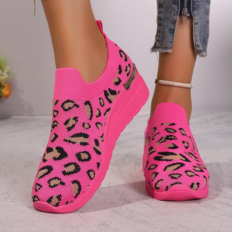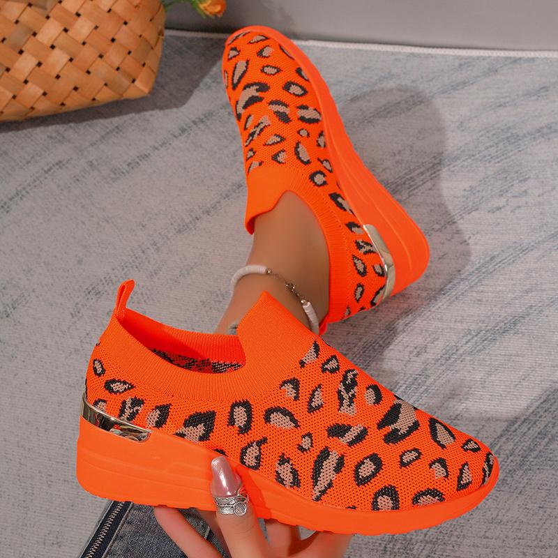 Модные вязаные кроссовки на танкетке с леопардовым принтом для женщин Легкие слипоны для бега Женские кроссовки с мягкой подошвой Удобная повседневная обувь 37-44