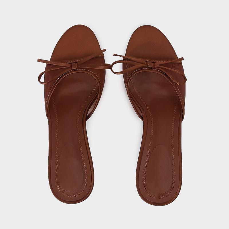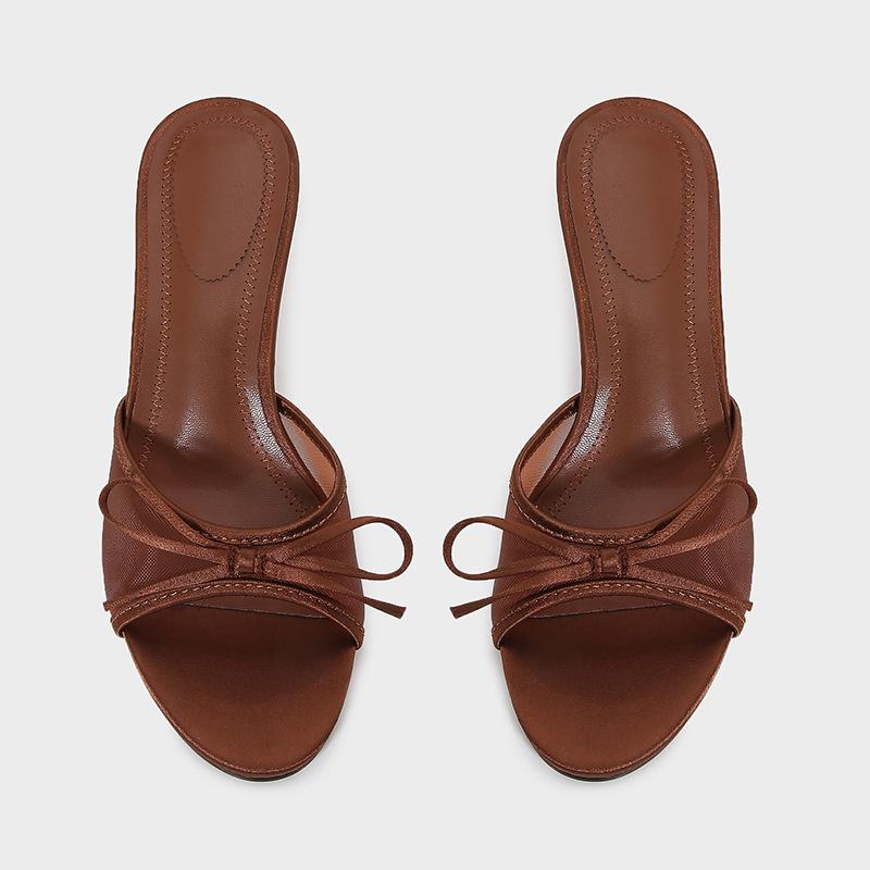 Fashion Elegant Brown Mesh Women Slippers Summer Fashion Bow Decoration Slide Sandals Sexy Peep Toe Thin High Heel Sandals Beach Shoes
